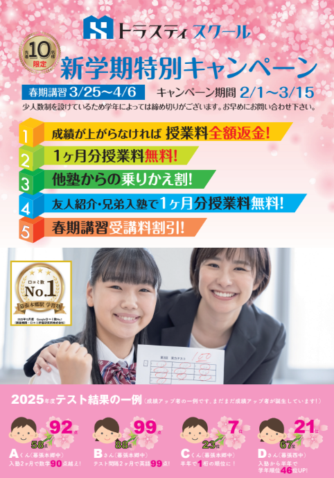 新しい学年は希望だけでなく、不安もつきものです。トラスティスクールは、そんなお子様と保護者様に寄り添い、**「わかるまで見放さない」**指導で徹底サポートします。